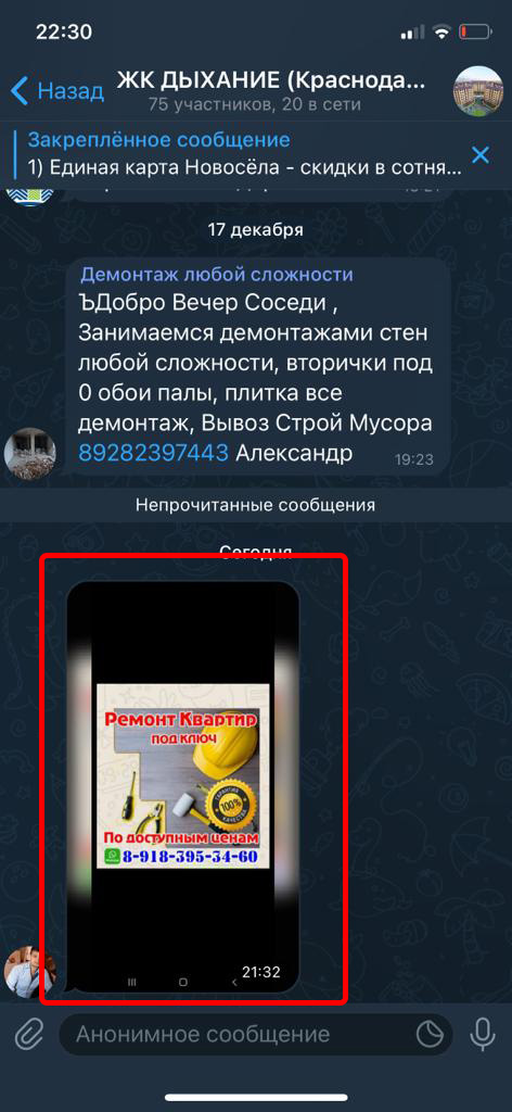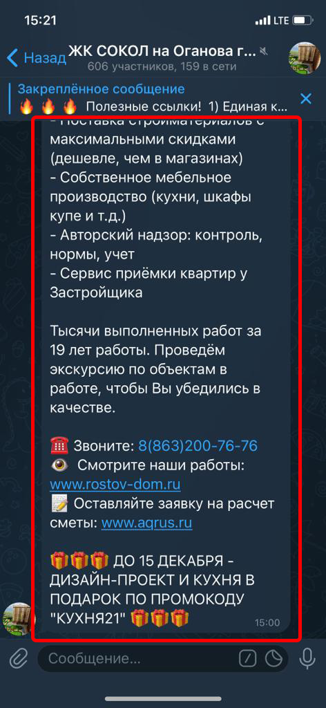 Реклама размещается в группах (чатах) жильцов в Телеграмм. Реклама закрепляется вверху каждой группы на месяц. Каждый пользователь заходя в группу постоянно видит закрепленное сообщение.